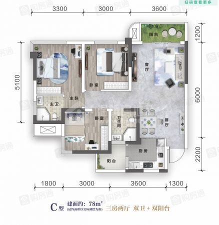 3室2厅/77.80m²/万汇中心(二期)